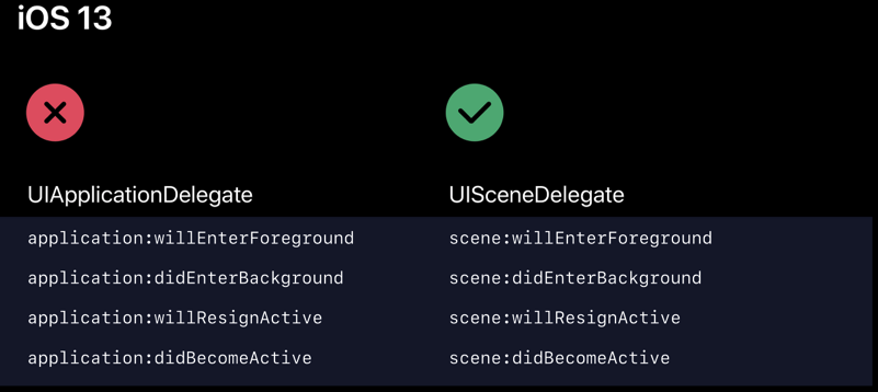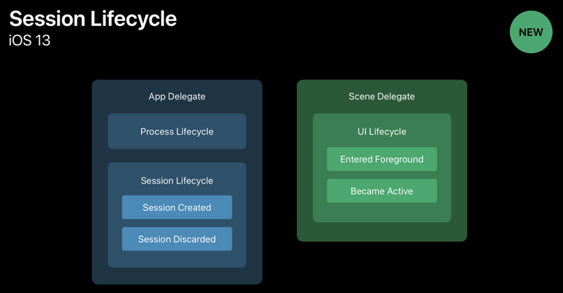 iOS13 이전에는 App Delegate가 앱이 Launch, terminate 됐는지 알수있었고, UI의 상태도 알아수있었지만, iOS13부터는 UI Lifecycle은 Scene Delegate가 관리하게 됨.